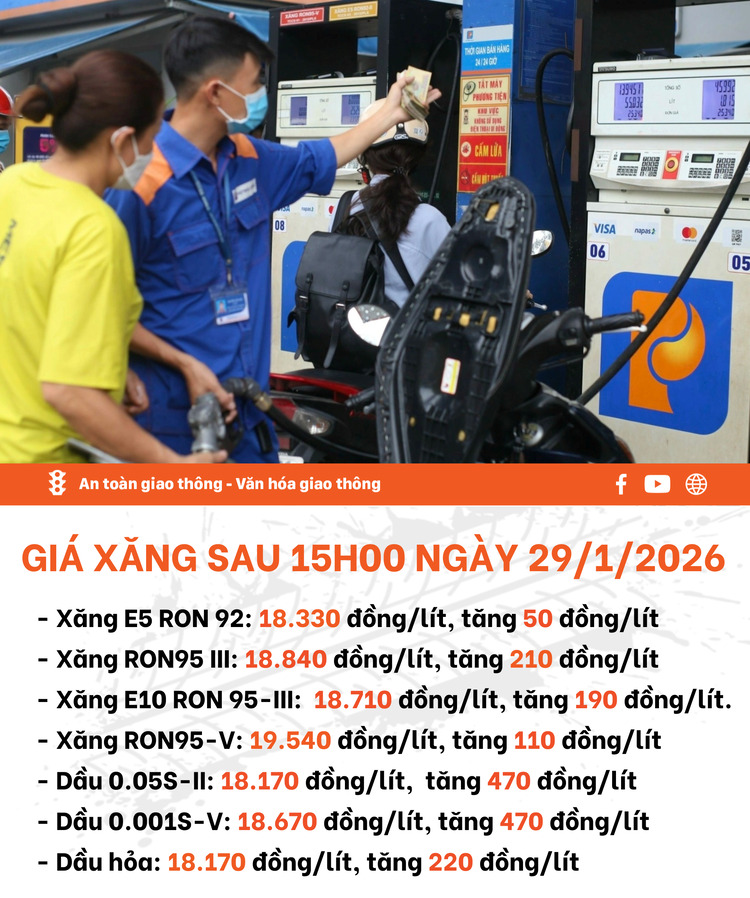 - Xăng E5 RON92: 18.330 đồng/lít, tăng 50 đồng/lít.